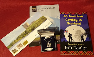 1 Prize Pack Containing – Sterling Silver Scottish Thistle necklace bought from Dundonald Castle Visitors Centre, signed paperback of An American Cowboy in Scotland, Dundonald Castle guidebook and postcard.